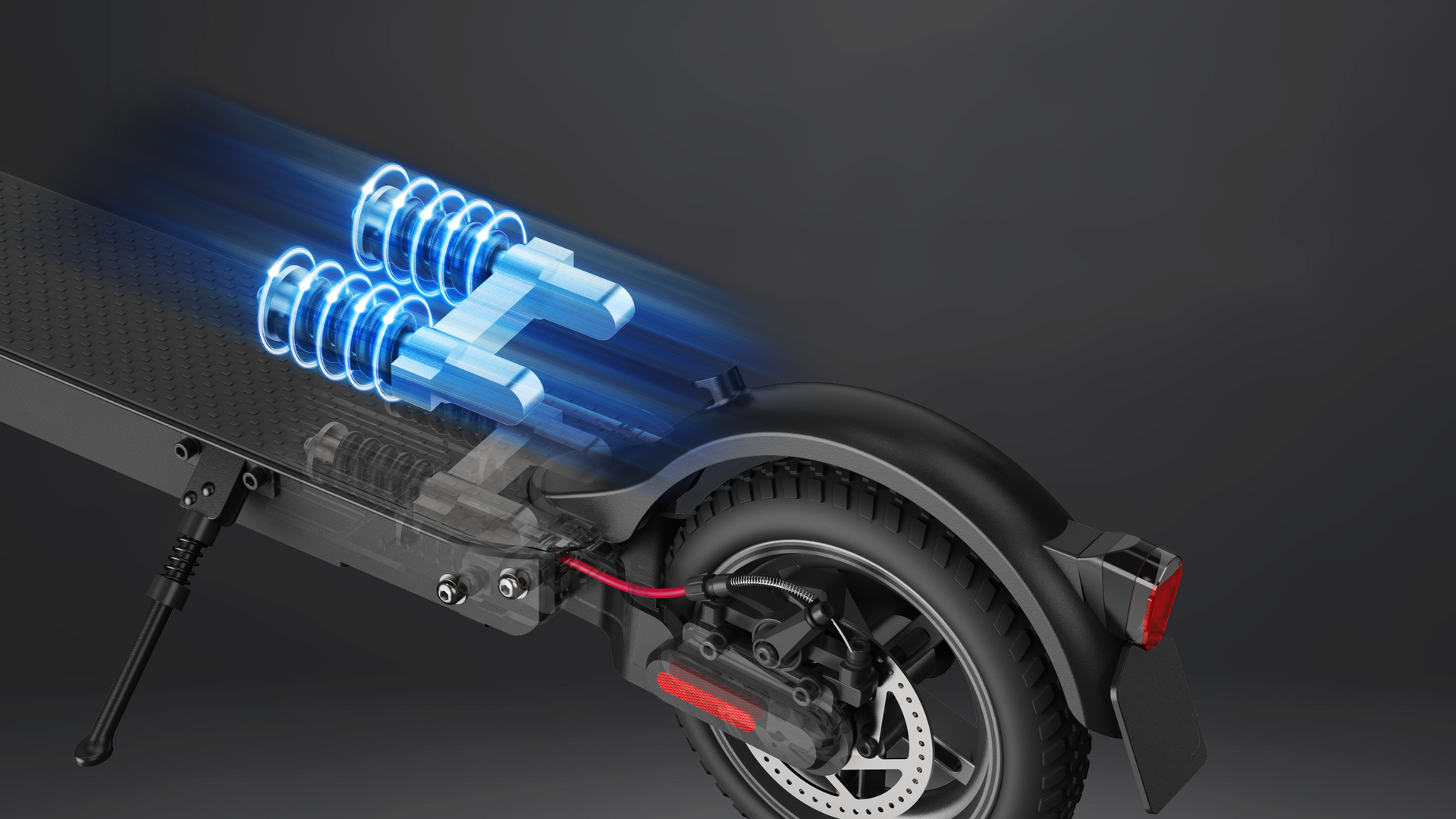E9 E-Scooter Mit Straßenzulassung verfügt über ein doppeltes Federungssystem, das Vibrationen und Erschütterungen währendder Fahrt effektiv reduziert und für ein besseres Fahrgefühl sorgt.