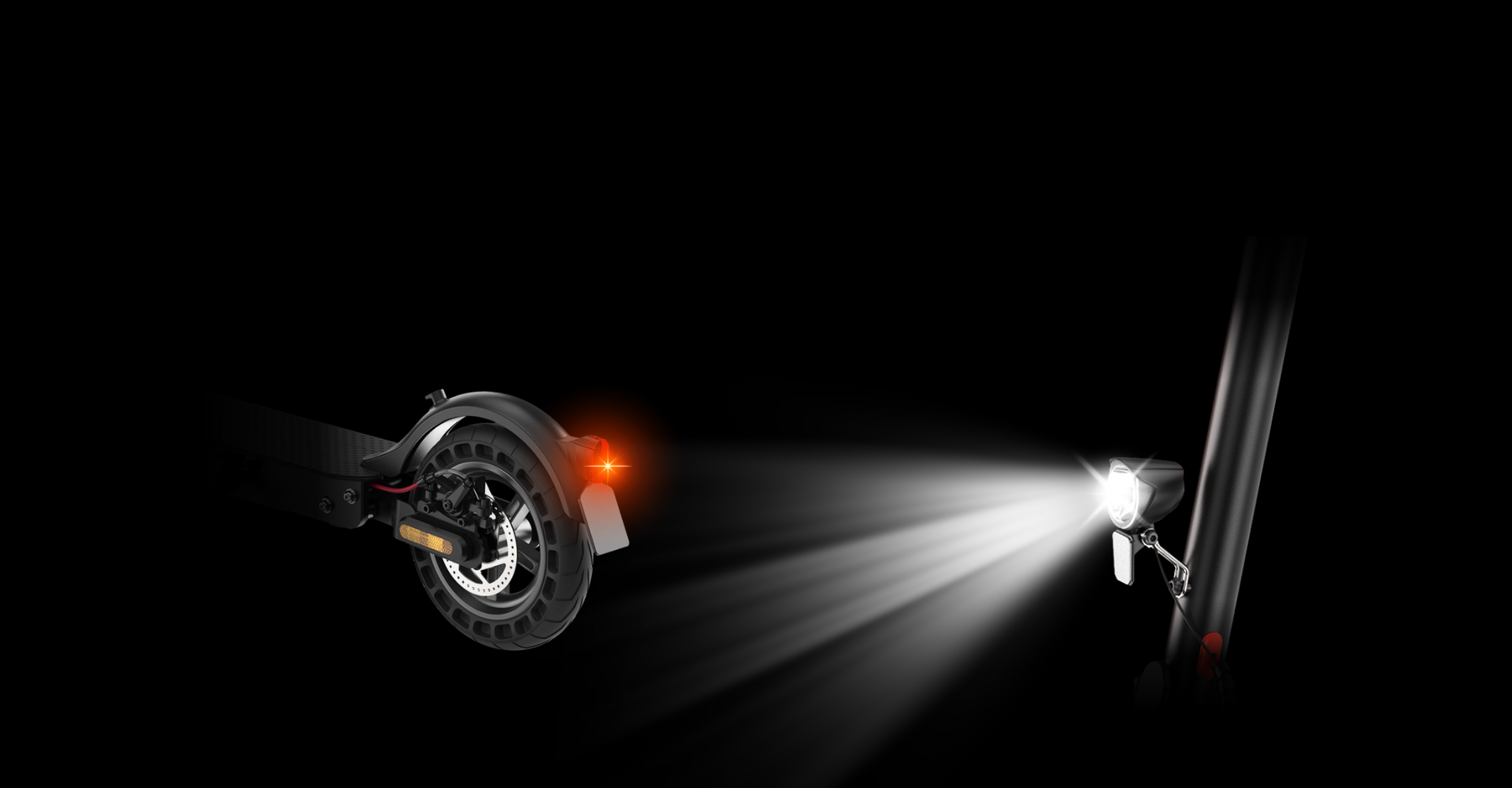 Mit einem starken Frontlicht (6W, 15m Reichweite) und einem integrierten Rücklicht ist für gute Sichtbarkeit auf freier Strecke gesorgt.