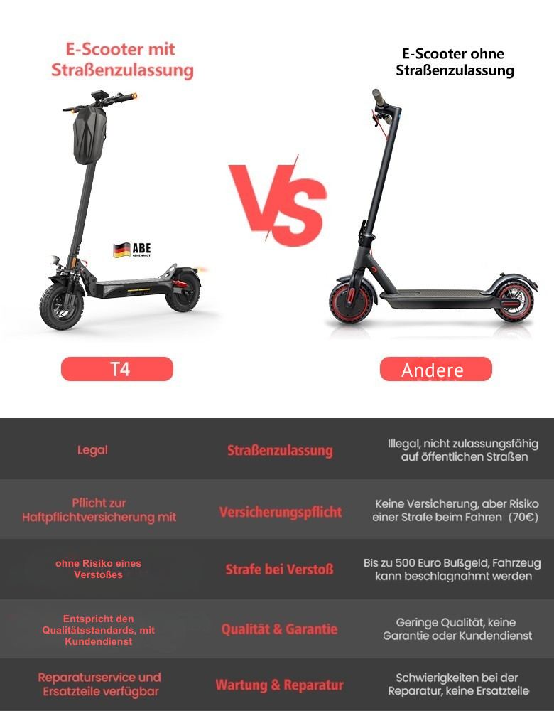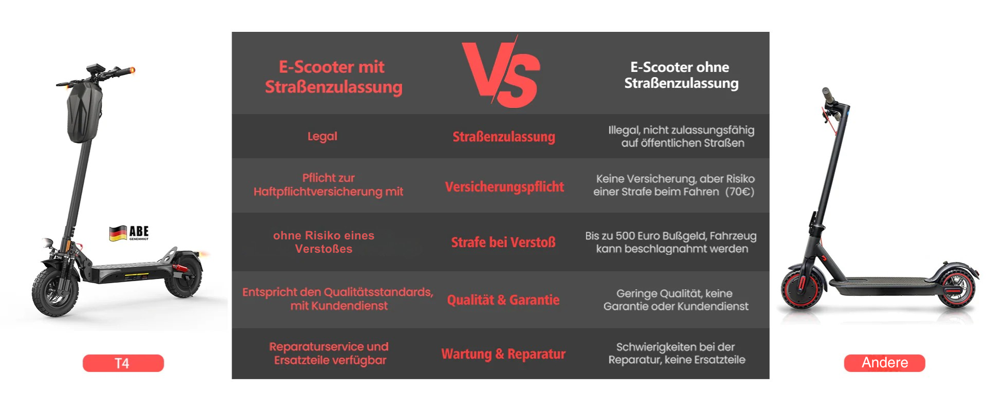 T4 offroad E-Scooter Vollständig konform mit deutschen Verkehrsvorschriften, mit TÜV ABE-Zulassung. Sorgenfrei und legal unterwegs.