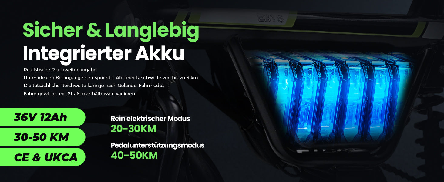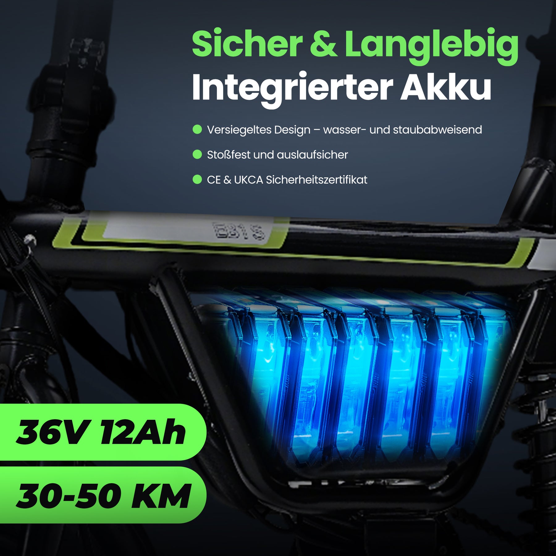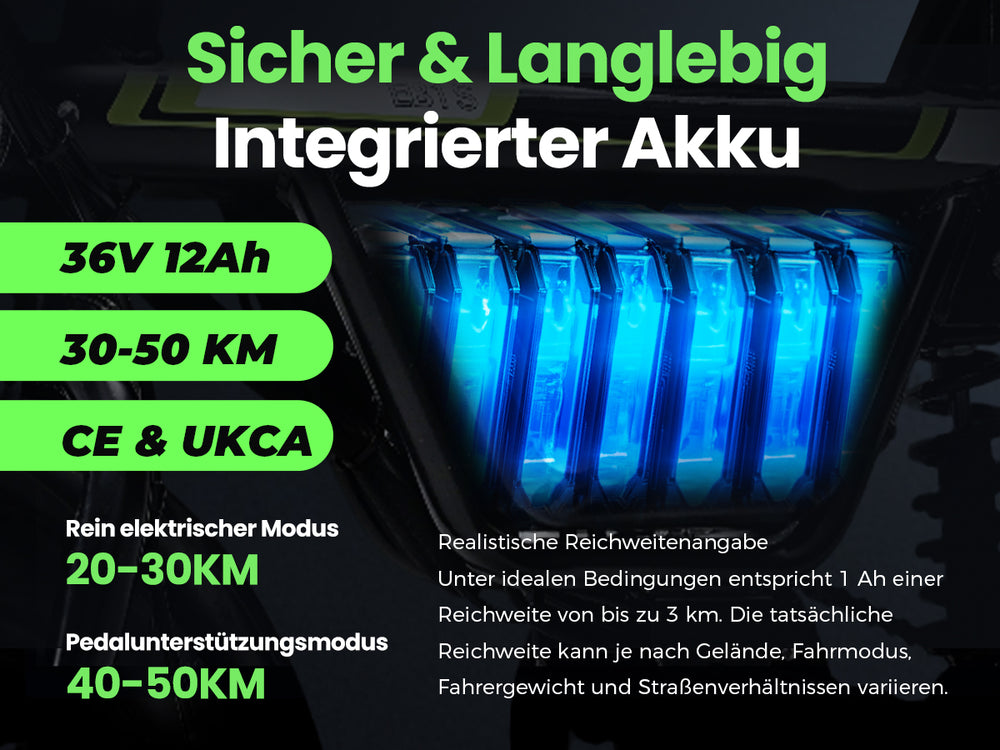 36 V, 12 Ah Lithium-Ionen-Akku. Wasserdicht nach IP65 (im Lieferumfang enthalten)