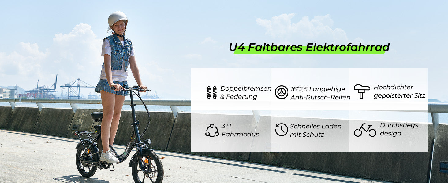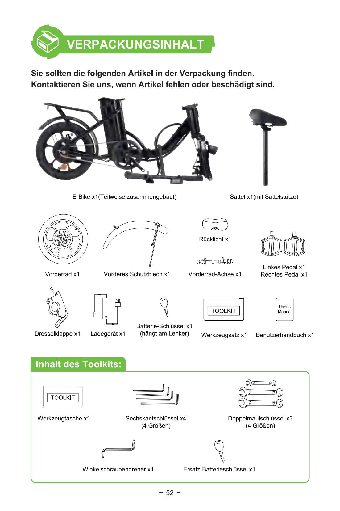 U4 Elektrofahrrad, Ladegerät, Pedale, Handbuch, Werkzeugtasche